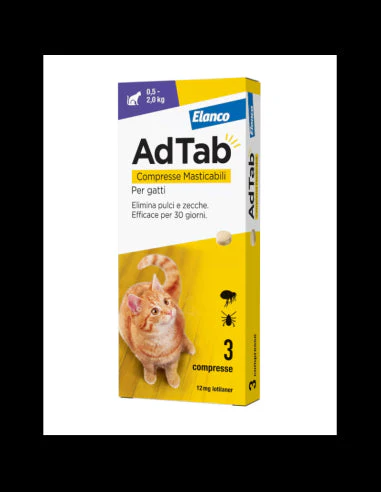 Le AdTab Compresse Masticabili 12mg per gatti con un peso corporeo compreso tra 0,5 e 2kg, sono un trattamento efficace e gustoso da assumere contro pulci e zecche. Queste compresse sono progettate per fornire un sollievo rapido e duraturo, eliminando i parassiti e prevenendo nuove infestazioni per un mese intero. Facili da somministrare grazie al loro sapore appetibile, rappresentano una soluzione pratica per la cura del tuo amico felino.