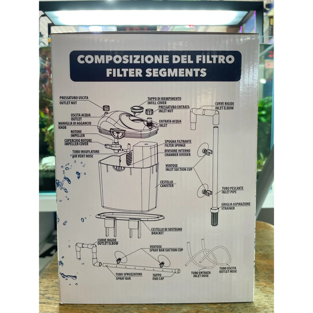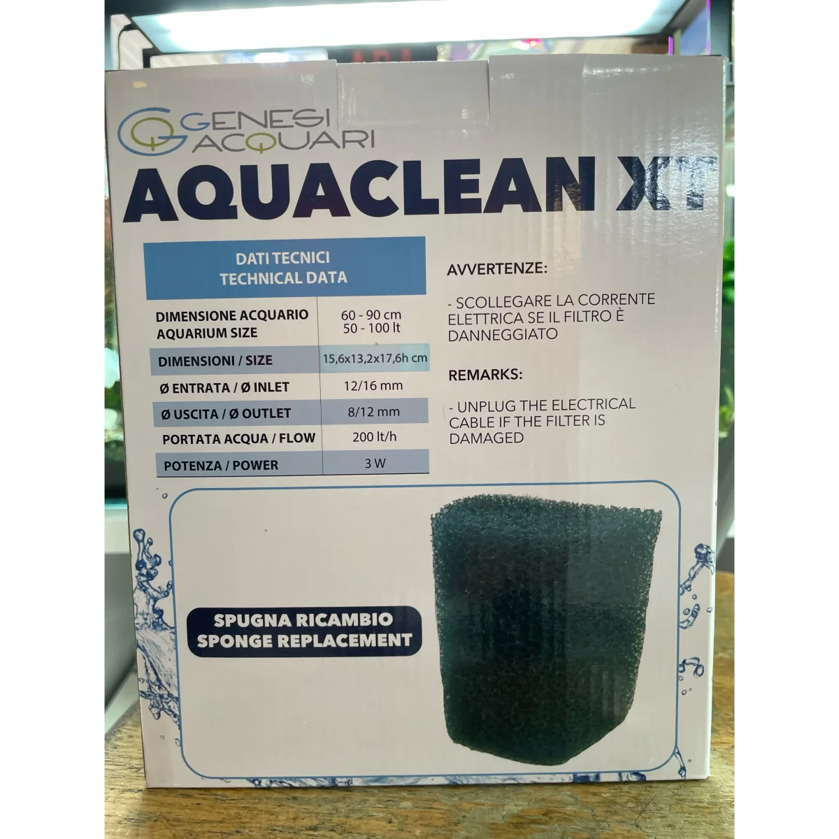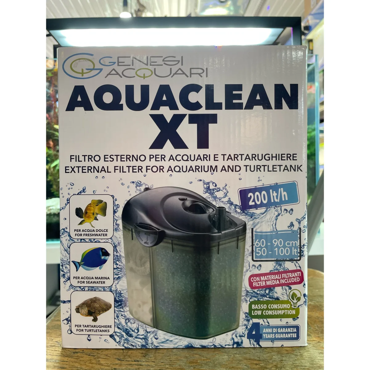 Il filtro esterno Aquaclean XT è adatto ad acquari, di acqua dolce e marina e tartarughiere, fino a 100 lt di capacità, con un portata di 200 lt/h.