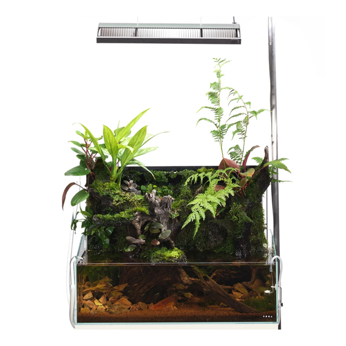 Prodotto accessorio in acrilico nero per disporre Wabi-Kusa e altre piante acquatiche su una superficie verticale, utilizzando il tappetino Wabi-Kusa in dotazione. Aggiungendo opzionalmente il DOOA Mist Flow si crea una leggera nebbia che fluttua a cascata dall’alto verso il basso. In questo modo la parete verticale ottiene l’umidità necessaria per la coltivazione delle piante emerse che sono vulnerabili alla mancanza d’acqua.