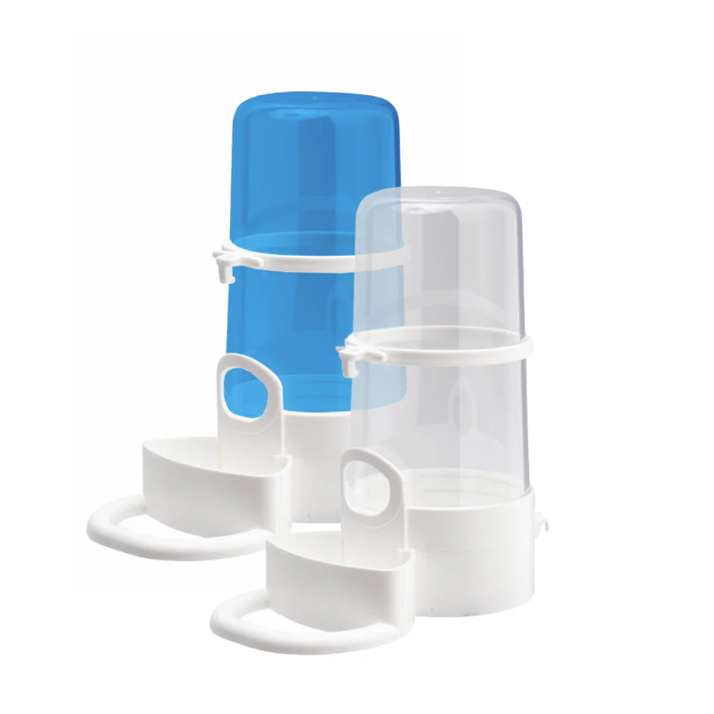 Abbeveratoio a sifone per volatili, realizzato in resistente plastica. Disponibile nei colori trasparente e blu trasparente, questo sifone ha una capacità di 400 ml e include un pratico anello per un facile fissaggio.